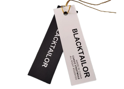 服裝吊牌即各種服裝上吊掛的牌子,包含一些服裝材質,洗滌注意事項等信息。從質地上看,吊牌的製作材料大多為紙質,也有塑料的、金屬的。另外,還出現了用全息防偽材料製成的新型吊牌。再從它的造型上看,則更是多種多樣的:有長條形的,對折形的,圓形的,三角形的,插袋式的以及其它特殊造型的,真是多姿多彩,琳琅滿目。